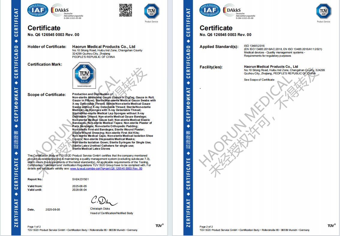 ເພື່ອເພີ່ມຄຸນນະພາບເພີ່ມເຕີມ, ພວກເຮົາໄດ້ສໍາເລັດການພິມເຜີຍແຜ່ເອກະສານຂັ້ນຕອນແລະຂັ້ນຕອນໃນການຄຸ້ມຄອງເອກະສານການຄຸ້ມຄອງທີ່ມີຄຸນນະພາບໃນວັນທີ 2024, ເພີ່ມເນື້ອຫາທີ່ກ່ຽວຂ້ອງກັບ MDR. ພວກເຮົາໄດ້ຜ່ານຂັ້ນຕອນທໍາອິດຂອງ Tuv Sud Audit ໃນວັນທີ 10 ເດືອນເມສາ, 2025, ແລະຫຼັງຈາກນັ້ນຂັ້ນຕອນທີສອງ. ສຸດທ້າຍ, ໃນເດືອນສິງຫາຂອງປີນີ້, ຈໍານວນໃບຢັ້ງຢືນຂອງພວກເຮົາທີ່ມີໃຫ້ເບິ່ງໃນລະບົບຂອງຮ່າງກາຍທີ່ໄດ້ຮັບການແຈ້ງເຕືອນ, ໃຫ້ມີການກ້າວສູ່ລະບົບການຄຸ້ມຄອງຄຸນນະພາບຂອງບໍລິສັດແລະສ້າງຄວາມເຂັ້ມແຂງໃຫ້ແກ່ການພັດທະນາຂອງບໍລິສັດ. ການບໍລິການດ້ານການແພດທີ່ກໍາຈັດຖິ້ມ (ຜ້າພັນບາດ, ຜ້າພັນບາດ, ຜ້າພັນບາດ, ແລະອື່ນໆ) ໃຫ້ລູກຄ້າທົ່ວໂລກມີຄຸນນະພາບແລະບໍລິການ.